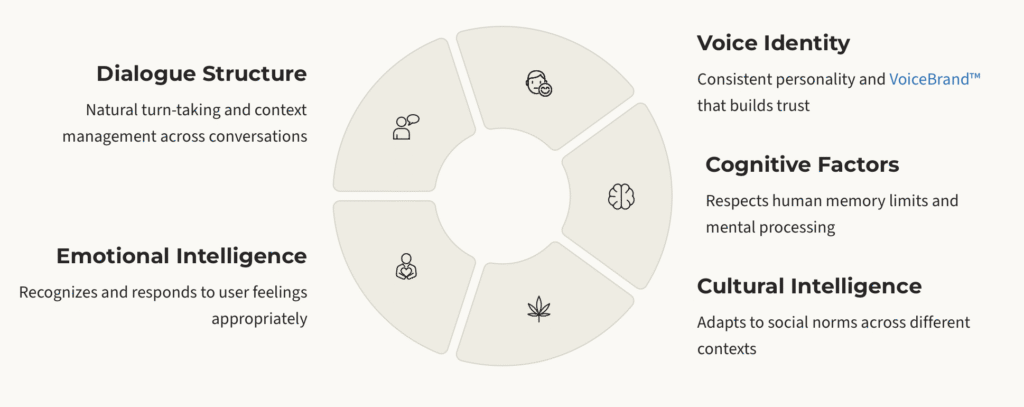 To lay the groundwork for conversational design akin to a “Human Operating System,” we identify several fundamental components or layers. Each of these addresses an aspect of human communication that voice UX designers should consider: