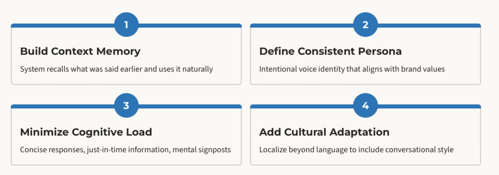 This component of HumanOSTM focuses on the human mind, how people perceive, process, and remember information in a conversation. Effective conversational engineering must align with the cognitive capabilities and limitations of users. One fundamental consideration is cognitive load. As mentioned earlier, listening and understanding in real-time is a cognitively intensive task; users can’t rewind a voice response (unless a repeat is explicitly requested) and they can’t see multiple choices laid out visually. Therefore, designers should aim to minimize the mental effort required at each step. Research and best practices suggest several strategies to manage cognitive load in voice interfaces: